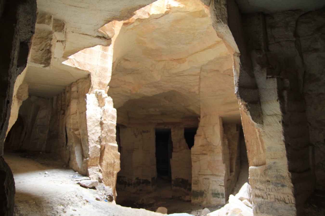 Kayalara yazılmış Arapça kitabelerden, bu taş ocağının 13. yüzyılda "Abdurrahman el-Hakkâri", "Muhammet İbn-i Bakır", "Muhammed el-'Uzzar" gibi şahıslar tarafından işletildiği anlaşılmaktadır. Çevredeki Harran, Şuayp şehri ve Han el-Ba'rur yapıları için yüzlerce yıl taş alınması neticesinde her iki mağarada da çok sayıda meydan, tünel ve galeriler meydana gelmiştir. Bunlardan özellikle büyük olanı yer yer iki katlı bir şekilde oyulmuş ve yükseklikleri 10-15 metreye varan ayaklar bırakılarak ortada meydanlar oluşturulmuştur. Ayrıca uzun galeri ve tünellerle dağın çeşitli yönlerine doğru çıkışlar sağlanmıştır.